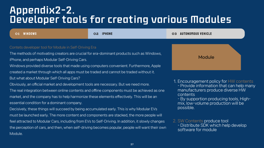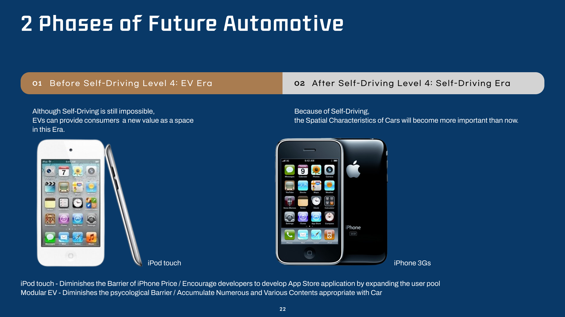 In addition, Modular EVs should serve as a bridge between the two phases of the future automotive market, just as the iPod touch did for the iPhone.